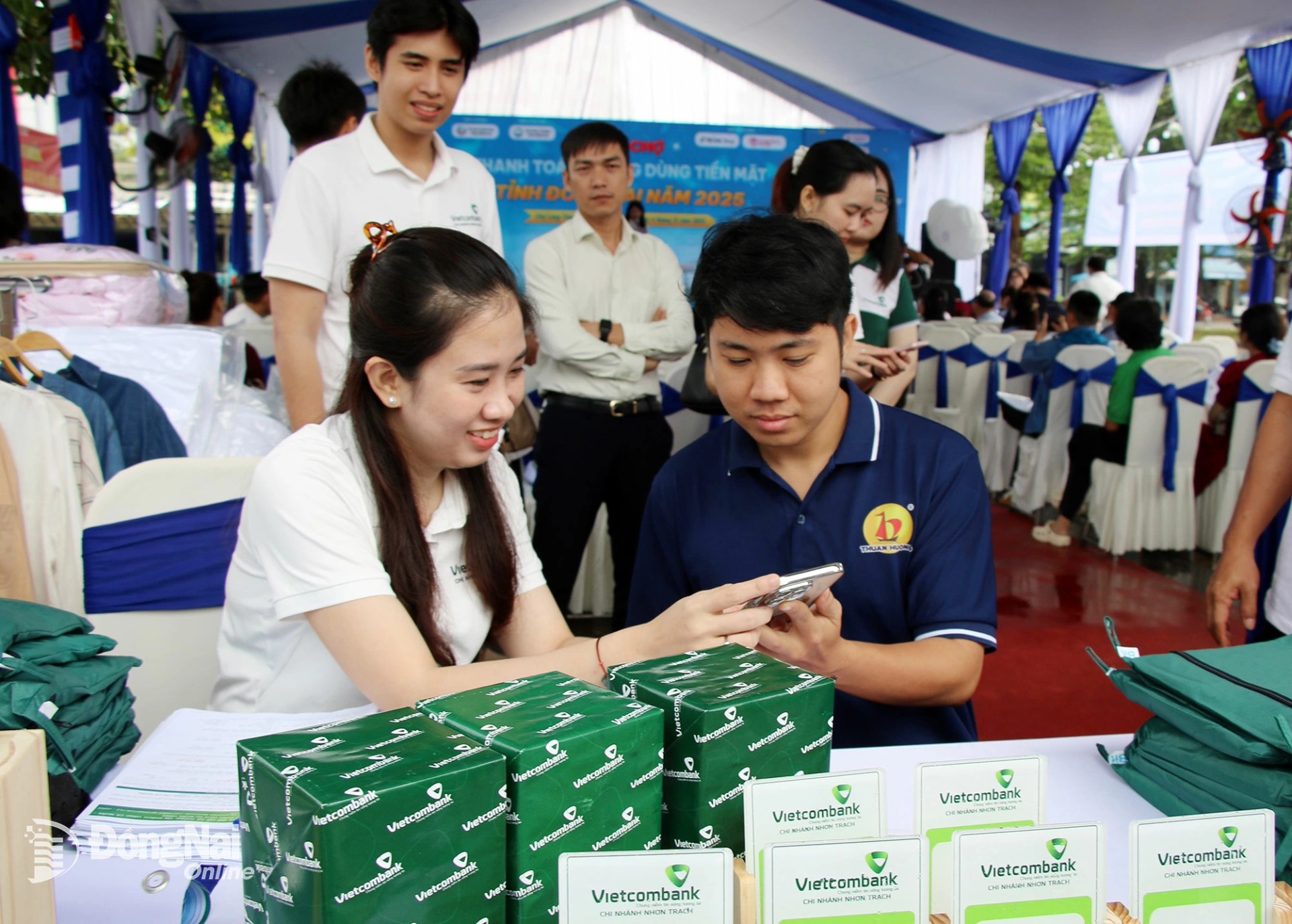 Nhân viên của Ngân hàng Vietcombank chi nhánh Nhơn Trạch giới thiệu, hướng dẫn các doanh nghiệp, cơ sở kinh doanh sử dụng các tiện ích ngân hàng số tại phiên chợ. Ảnh: Hải Quân