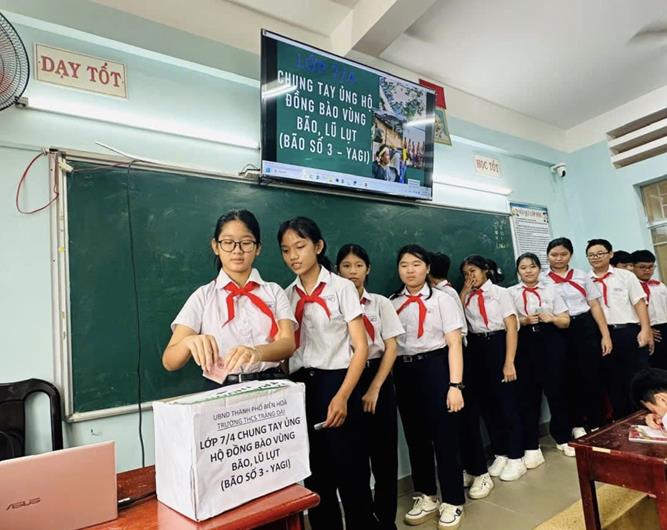 Học sinh Trường Trung học cơ sở Trảng Dài (thành phố Biên Hòa) quyên góp ủng hộ đồng bào miền Bắc khắc phục hậu quả số 3