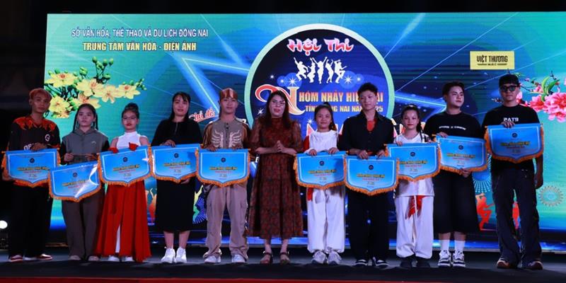 Giám đốc Trung tâm Văn hóa - Điện ảnh Đồng Nai Tôn Thị Thanh Tình trao cờ lưu niệm cho các nhóm nhảy tham gia