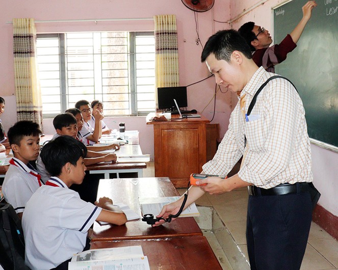 Thành viên đoàn giám sát đo chỉ số ánh sáng trong lớp học tại trường học ở huyện Trảng Bom