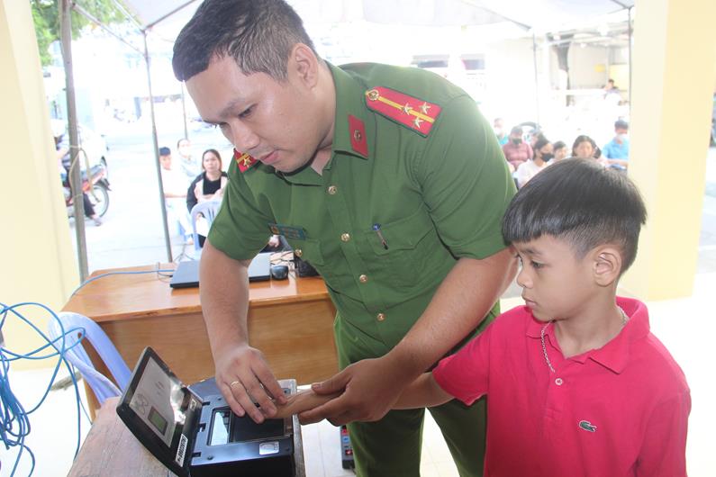 Cán bộ Công an phường Tam Hiệp thu nhận dữ liệu làm thẻ căn cước cho người dân.
