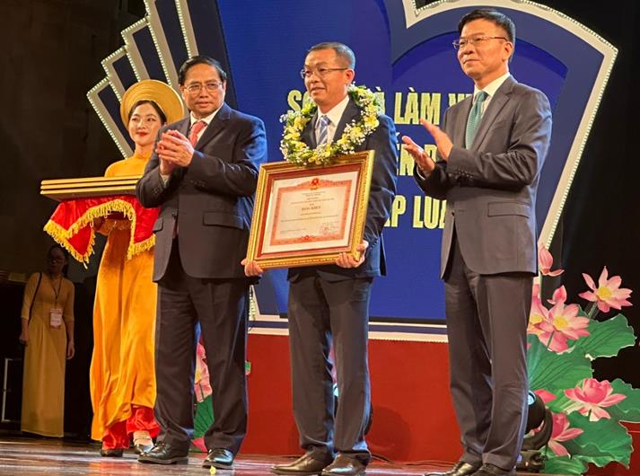 Ông Phan Quang Tuấn đại diện tập thể Sở Tư pháp nhận bằng khen của Thủ tướng Chính phủ về thành tích xuất sắc trong 10 năm thực hiện Ngày Pháp luật Việt Nam.