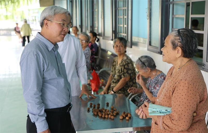 Chủ tịch Ủy ban MTTQ Việt Nam tỉnh Cao Văn Quang thăm hỏi người cao tuổi đang được chăm sóc tại Cơ sở Bảo trợ xã hội dưỡng lão tình thương Suối Tiên (xã Cây Gáo, huyện Trảng Bom).