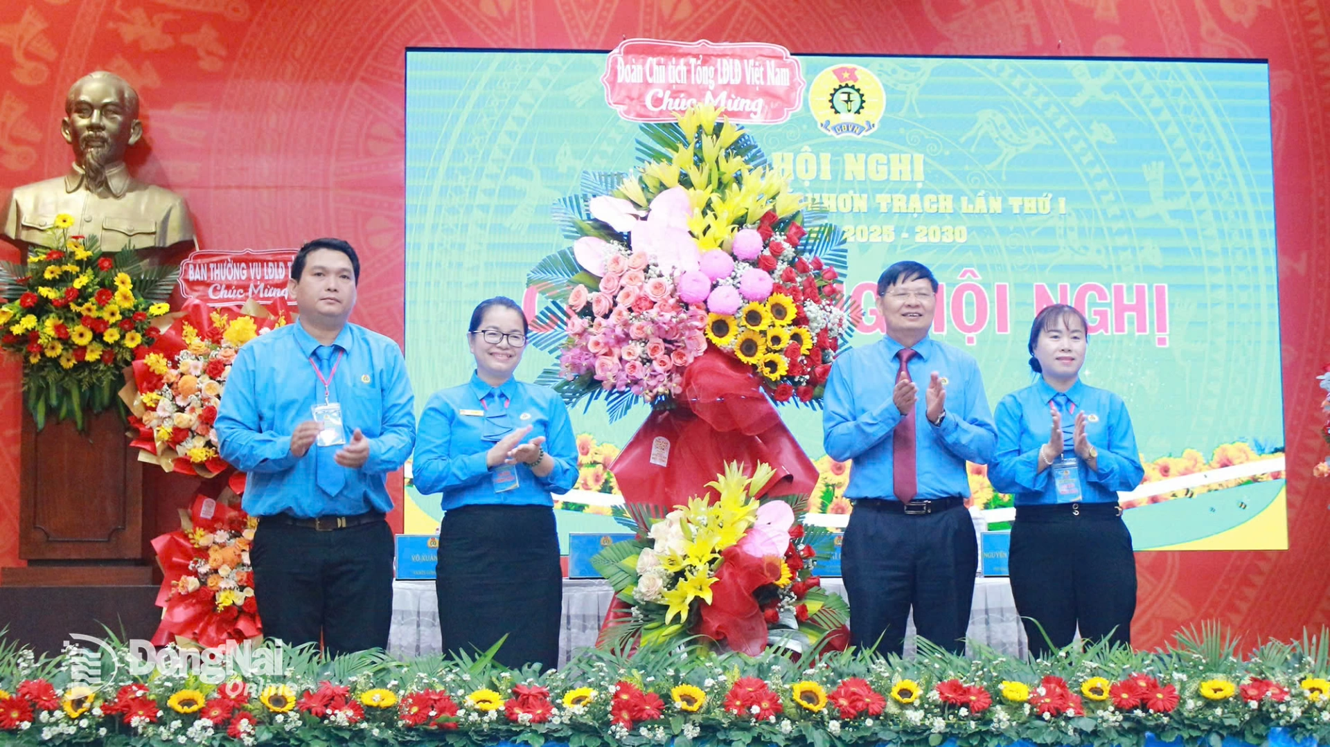 | Phó Chủ tịch Tổng Liên đoàn Lao động Việt Nam Phan Văn Anh tặng hoa chúc mừng hội nghị. Ảnh: N.Hòa |