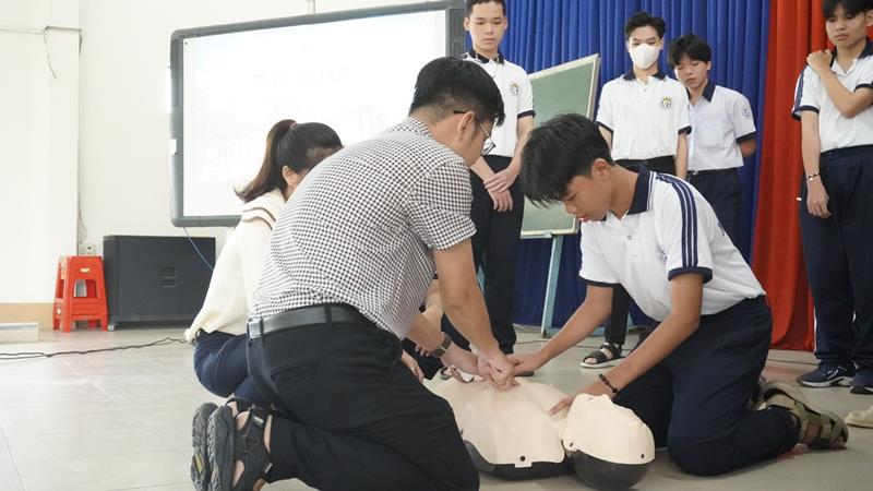 Tại lớp tập huấn, các y, bác sĩ của Bệnh viện Nhi đồng Đồng Nai đã hướng dẫn các em học sinh cách nhận biết và sơ cấp cứu ban đầu đúng cách đối với bệnh nhân bị đột quỵ và đuối nước.