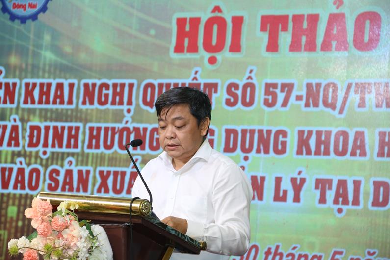 (CTT-Đồng Nai) - Sáng 30-5, Ban Quản lý các Khu công nghiệp Đồng Nai tổ chức Hội thảo triển khai Nghị quyết số 57-NQ/TW của Bộ Chính trị và định hướng ứng dụng khoa học công nghệ vào sản xuất và quản lý tại doanh nghiệp (DN). Tham dự Hội thảo có Ủy viên Ban Thường vụ Tỉnh ủy, Phó Chủ tịch UBND tỉnh Dương Minh Dũng; lãnh đạo các sở, ban, ngành và các chuyên gia, DN trên địa bàn tỉnh.