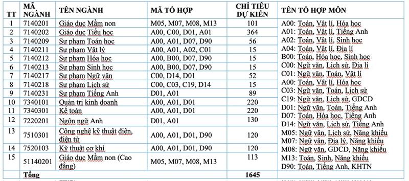 Trong số 15 ngành xét tuyển, ngành giáo dục tiểu học có chỉ tiêu nhiều nhất với 364 chỉ tiêu; ngành sư phạm tiếng Anh và quản trị kinh doanh cùng có 220 chỉ tiêu; ngành ngôn ngữ Anh có 130 chỉ tiêu; các ngành: sư phạm Vật lý, sư phạm Hóa học, Sư phạm Sinh học, sư phạm Lịch sử cùng có 15 chỉ tiêu. Chỉ tiêu tuyển sinh các ngành còn lại như sau: sư phạm Ngữ văn (52), sư phạm Toán (56), sư phạm tiếng Anh (89), giáo dục mầm non (hệ đại học 101 chỉ tiêu, hệ cao đẳng 113 chỉ tiêu), công nghệ kỹ thuật điện - điện tử (120), kỹ thuật cơ khí (120).