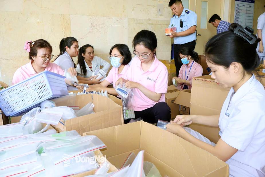 Nhân viên y tế Bệnh viện Đa khoa Đồng Nai tập trung đóng gói thuốc mang đi hỗ trợ người dân Đắk Lắk. Ảnh: BVCC