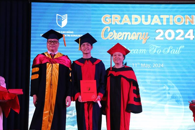 Hiệu trưởng Trường Cao đẳng Công nghệ và quản trị Sonadezi Nguyễn Tiến Mạnh trao bằng tốt nghiệp cho tân cử nhân.