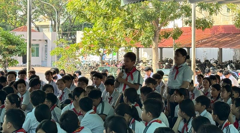 Các em học sinh Học sinh Trường Trung học cơ sở Tân Bửu, thành phố Biên Hòa giao lưu, trả lời câu hỏi tại buổi sinh hoạt