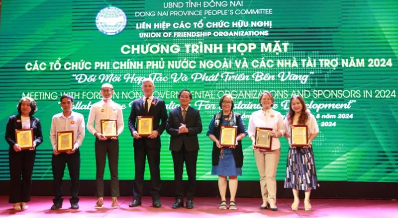 Dịp này, Liên hiệp các tổ chức hữu nghị tỉnh đã trao tặng bảng Tri ân cho 18 tổ chức phi chính phủ nước ngoài, doanh nghiệp FDI và hiệp hội nước ngoài đã có nhiều đóng góp tích cực đối với sự phát triển bền vững của tỉnh Đồng Nai từ năm 2023 đến nay. Các tổ chức phi chính phủ nước ngoài, doanh nghiệp FDI, Hiệp hội nước ngoài đã trao bảng tượng trưng tiếp tục hợp tác với tỉnh Đồng Nai triển khai dự án PCPNN giai đoạn tới.