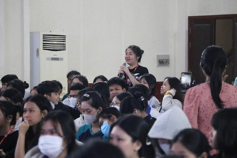 Sinh viên Trường Cao đẳng Công nghệ và quản trị Sonadezi đặt câu hỏi giao lưu với các đại biểu tham gia lễ ký kết biên bản ghi nhớ hợp tác.