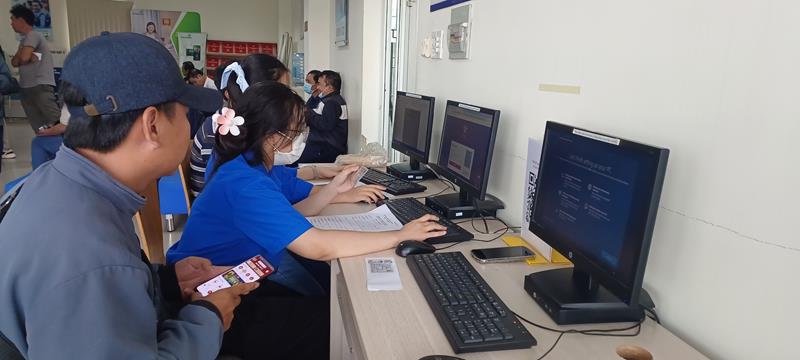 Các sinh viên tình nguyện đang hỗ trợ, hướng dẫn cho người dân về các thao tác đăng ký cấp phiếu LLTP trực tuyến.