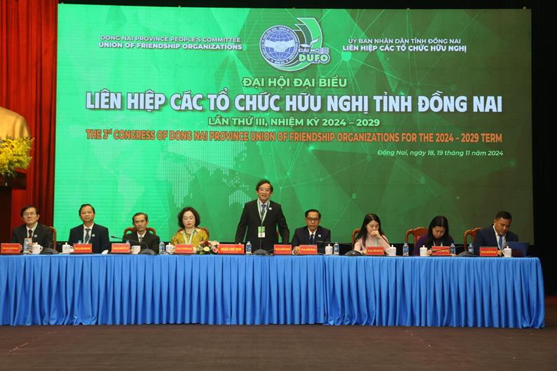 (CTT-Đồng Nai) - Ngày 18-11, 250 đại biểu chính thức đại diện cho 11 ngàn hội viên của 10 hội hữu nghị thành viên thuộc Liên hiệp các tổ chức hữu nghị tỉnh đã về Trung tâm Hội Nghị và tổ chức sự kiện tỉnh để tham gia phiên khai mạc và ngày làm việc đầu tiên của Đại hội đại biểu Liên hiệp các tổ chức hữu nghị tỉnh khóa III, nhiệm kỳ 2024-2029, chủ đề: Đoàn kết - Đổi mới - Linh hoạt - Sáng tạo.