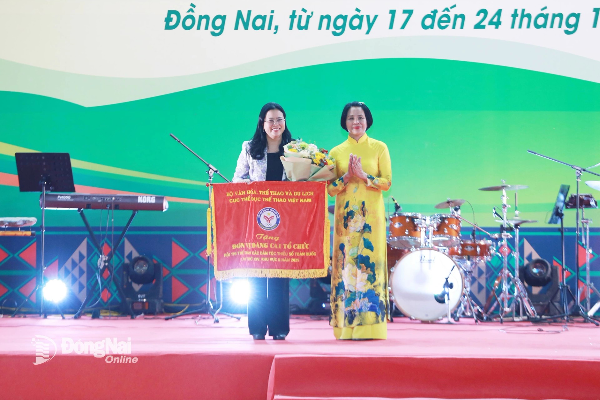 Phó Cục trưởng Cục thể dục thể thao Việt Nam, Trưởng Ban Tổ chức Trung ương Lê Thị Hoàng Yến (phải) tặng cờ cho Ban Tổ chức địa phương. Ảnh: Huy Anh