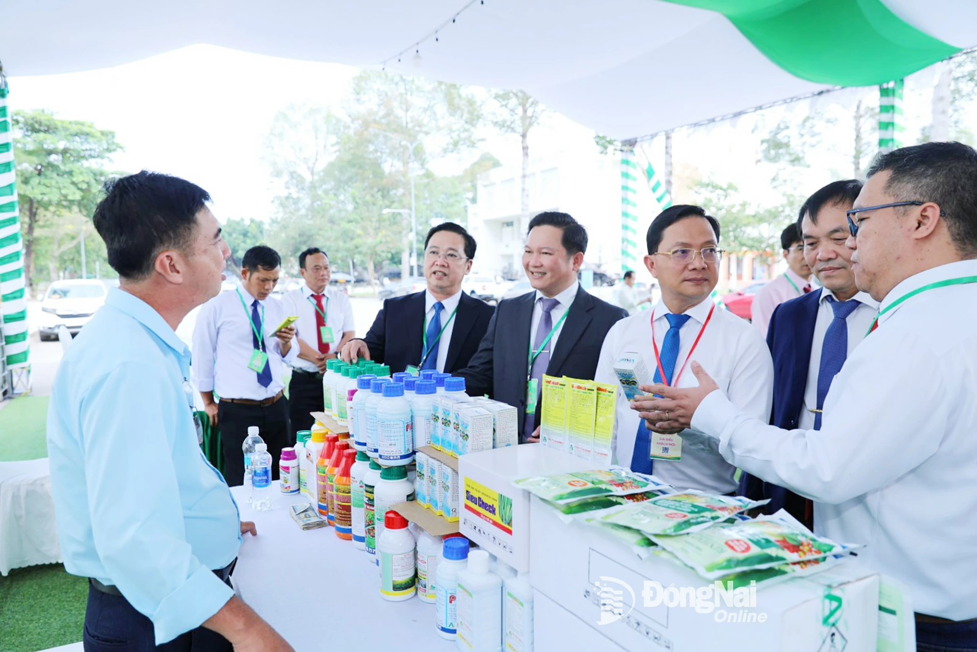Ủy viên Ban Thường vụ Tỉnh ủy, Phó Chủ tịch Thường trực Ủy ban MTTQ Việt Nam tỉnh Đồng Nai Hà Anh Dũng cùng lãnh đạo Hội Nông dân tỉnh và Sở Nông nghiệp và Môi trường tham quan khu trưng bày sản phẩm nông nghiệp tiêu biểu bên lề đại hội. Ảnh: Huy Anh