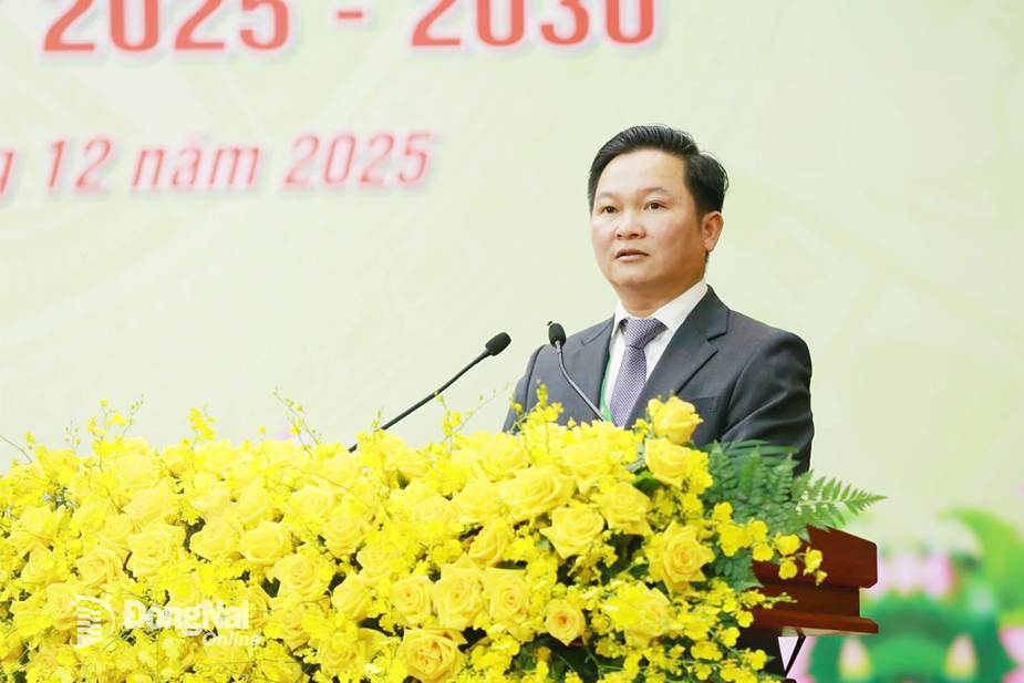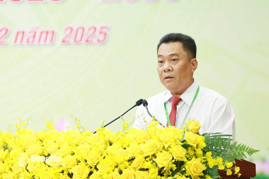 Phó Chủ tịch Hội Nông dân tỉnh Đồng Nai Nguyễn Văn Giang báo cáo kết quả đạt được giai đoạn 2023-2025. Ảnh: Huy Anh