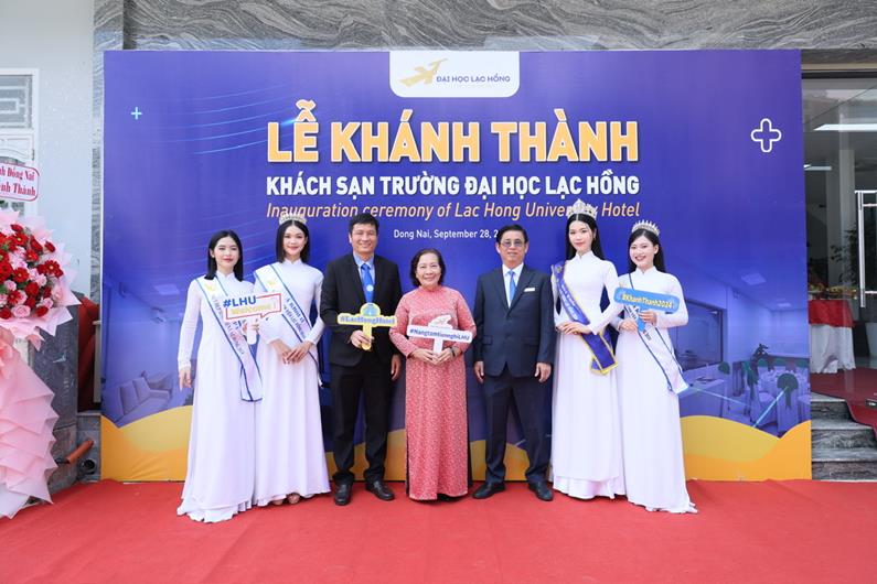 Ban Giám hiệu Trường Đại học Lạc Hồng và sinh viên nhà trường chụp hình tại sự kiện khánh thành Khách sạn Trường Đại học Lạc Hồng