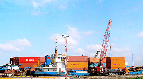 Quý I, Đồng Nai xuất siêu 400 triệu USD. Trong ảnh: Bốc xếp hàng hóa tại cảng Đồng Nai khu vực Long Bình Tân.