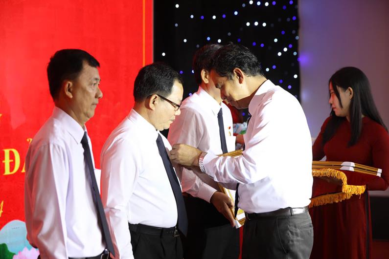 Trưởng Ban Nội chính Tỉnh ủy Trần Trung Nhân trao kỷ niệm chương cho các thẩm phán Tòa án nhân dân tỉnh.