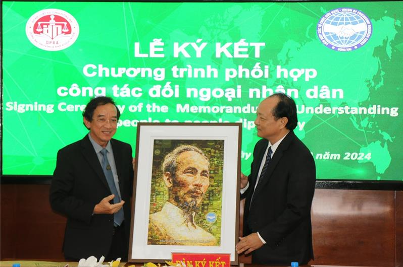Lãnh đạo Liên hiệp các tổ chức hữu nghị tỉnh và Đoàn Luật sư tỉnh tặng quà lưu niệm tại lễ ký kết chương trình phối hợp về công tác đối ngoại nhân dân giai đoạn 2024 - 2029.