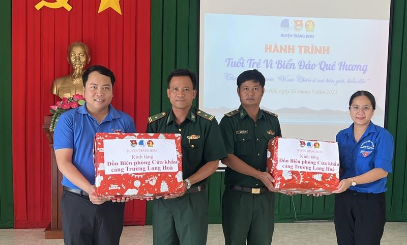 Chị Trần Thị Thanh Thanh (bìa phải) trao quà cho cán bộ, chiến sĩ Bộ đội biên phòng cửa khẩu Trường Long Hòa, tỉnh Trà Vinh trong hành trình vì biển đảo quê hương