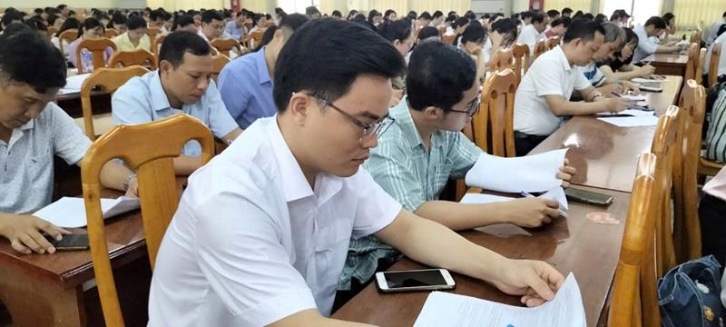 Cán bộ, đảng viên, công chức, viên chức thuộc Đảng bộ Khối các cơ quan tỉnh điền thông tin vào phiếu điều tra dư luận xã hội về phát triển hạ tầng đồng bộ