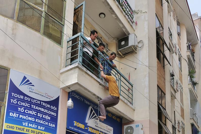 Công an thành phố Biên Hòa hướng dẫn người dân chung cư C23 (phường Hòa Bình) thoát hiểm bằng thang dây.