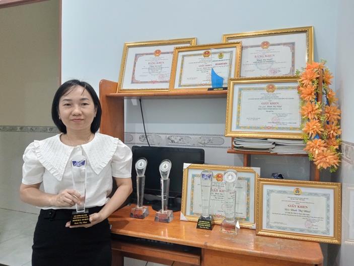 Chị Đinh Thị Nhài, cán bộ Thư viện Đồng Nai bên bộ sưu tập các giải thưởng đoạt được trong nhiều năm qua