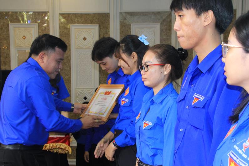 Phó bí thư Tỉnh đoàn, Chủ tịch Hội LHTN tỉnh Nguyễn Hiếu Trung trao bằng khen cho các tập thể đạt thành tích xuất sắc trong chiến dịch TNTN hè