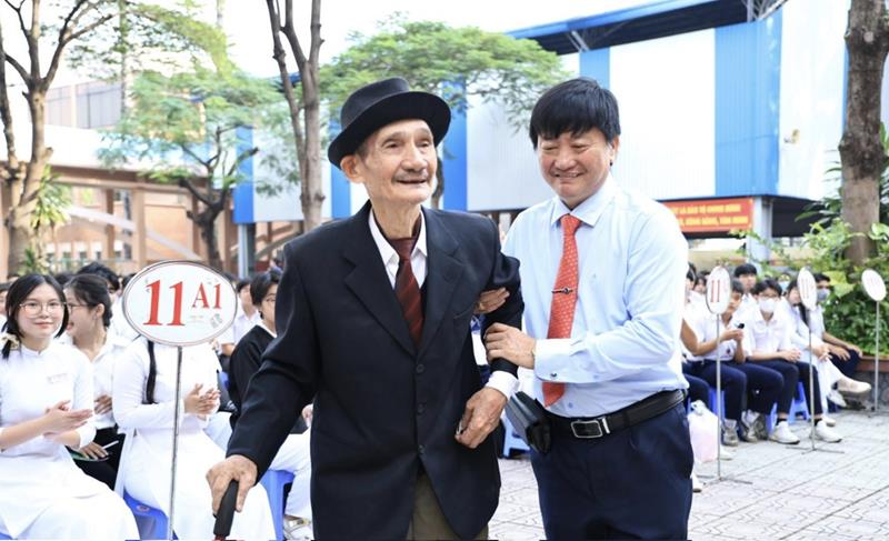 Hiệu trưởng Trường THPT Ngô Quyền Phan Trọng Nghĩa đón nhà giáo Tô Hoàng Lộc, người hiệu trưởng đầu tiên của trường đến dự buổi kỷ niệm