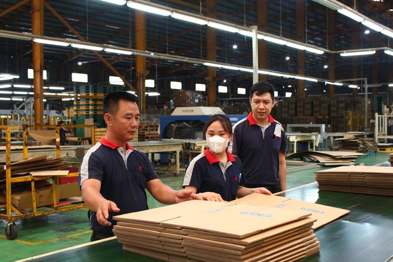 Bí thư Chi bộ, Chủ tịch CĐCS Công ty TNHH Giấy Yuen Foong Yu Đồng Nai (huyện Long Thành) Đỗ Nguyên Phương hỏi thăm công nhân tại xưởng sản xuất