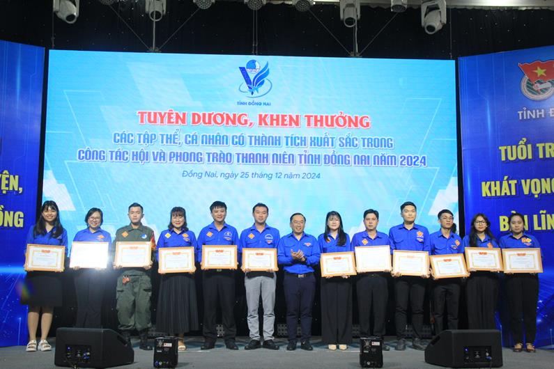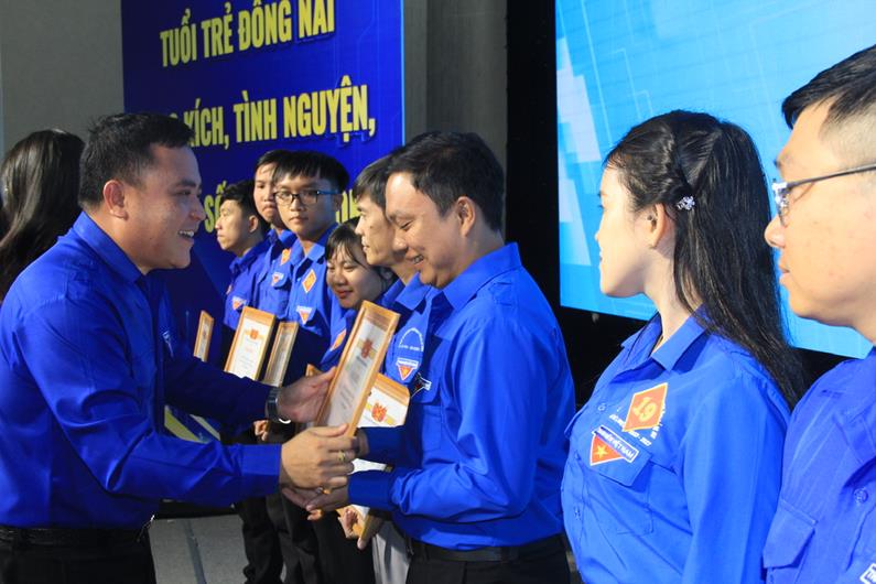 Phó Bí thư Tỉnh đoàn, Chủ tịch Hội Liên hiệp Thanh niên tỉnh Nguyễn Hiếu Trung trao bằng khen cho các tập thể có thành tích xuất sắc trong công tác Hội và Phong trào thanh niên tỉnh Đồng Nai năm 2024