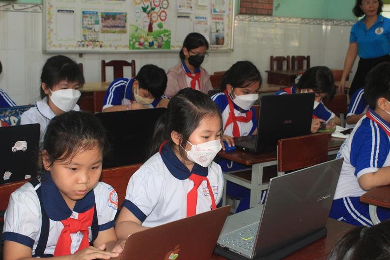 Các em học sinh Trường tiều học Lê Văn Tám (TP.Biên Hòa) tham gia cuộc thi vẽ tranh bằng phần mềm Canva