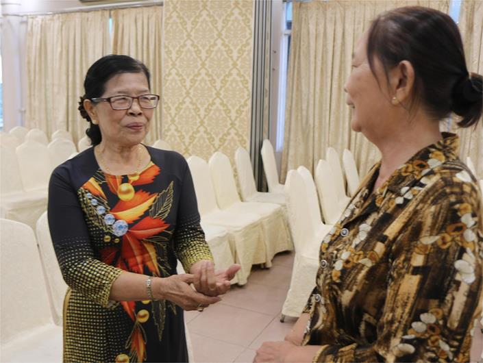 Bà Trần Thị Lài (bên trái) trò chuyện cùng bạn bè về quá trình đang đảm nhận đến 9 nhiệm vụ cấp xã tại xã Phú Sơn, huyện Tân Phú của mình