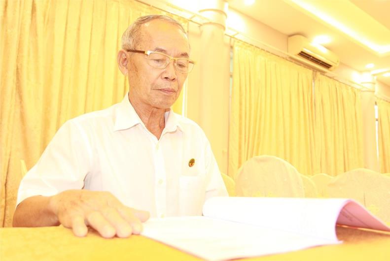 Ông Chu Mạnh Toàn đang đảm nhận đến 5 vai trò ở xã Phước Thái, huyện Long Thành đọc tài liệu trước khi phát biểu tham luận tại Hội nghị kỷ niệm 83 năm Ngày truyền thống người cao tuổi Việt Nam (6-6-1941 - 6-6-2024)