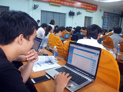 Đại diện các nhà thuốc tham gia tập huấn về ứng dụng CNTT vào quản lý nhà thuốc do Sở Y tế tổ chức.