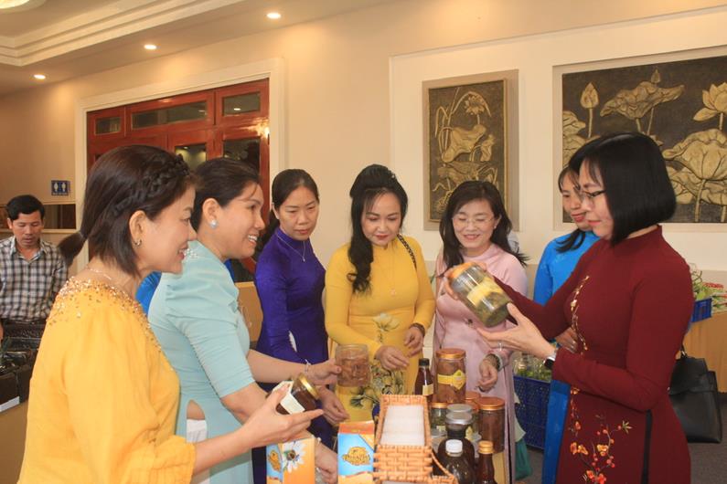 Phó Chủ tịch UBND tỉnh Nguyễn Thị Hoàng (bìa phải) tham quan gian hàng khởi nghiệp của phụ nữ
