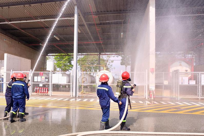 Lực lượng chữa cháy của Công an tỉnh và Công ty TNHH Bosch Việt Nam (Khu công nghiệp Long Thành, huyện Long Thành) tham gia diễn tập ứng phó sự cố hóa chất theo phương án cấp tỉnh vào ngày 25-10