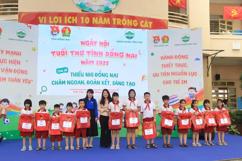Dịp này, Tỉnh đoàn, Hội đồng Đội tỉnh cũng đã trao 50 phần quà cho các em thiếu nhi có hoàn cảnh khó khăn tại huyện Vĩnh Cửu.