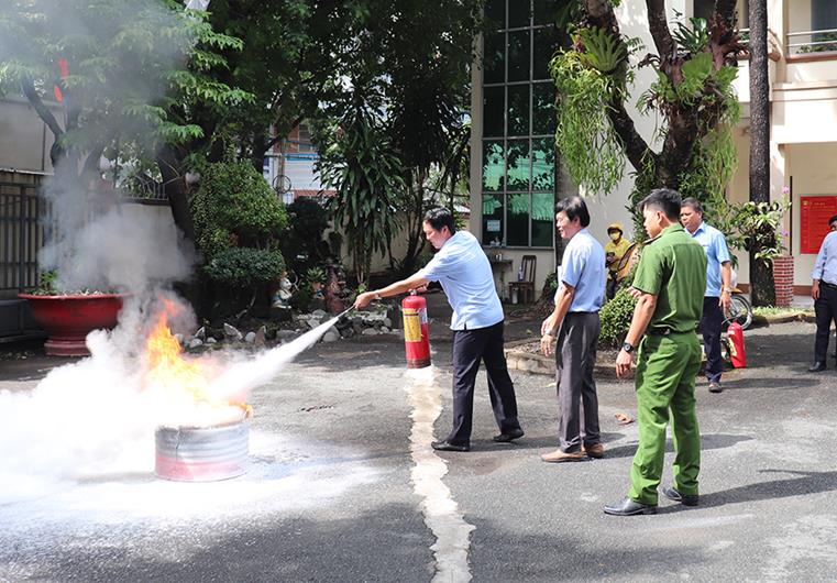 Cán bộ, nhân viên Sở Y tế thực hành dập tắt đám cháy