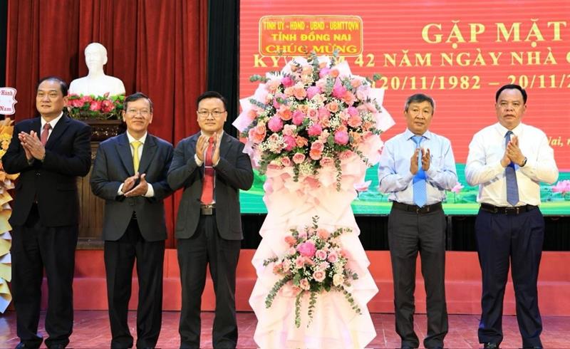 Phó Bí thư thường trực Tỉnh ủy Hồ Thanh Sơn và Phó Bí thư Tỉnh ủy, Chủ tịch UBND tỉnh Võ Tấn Đức tặng lẵng hoa của Tỉnh uỷ, HĐND, UBND và Ủy ban MTTQ Việt Nam tỉnh cho tập thể sư phạm Trường Đại học Đồng Nai.