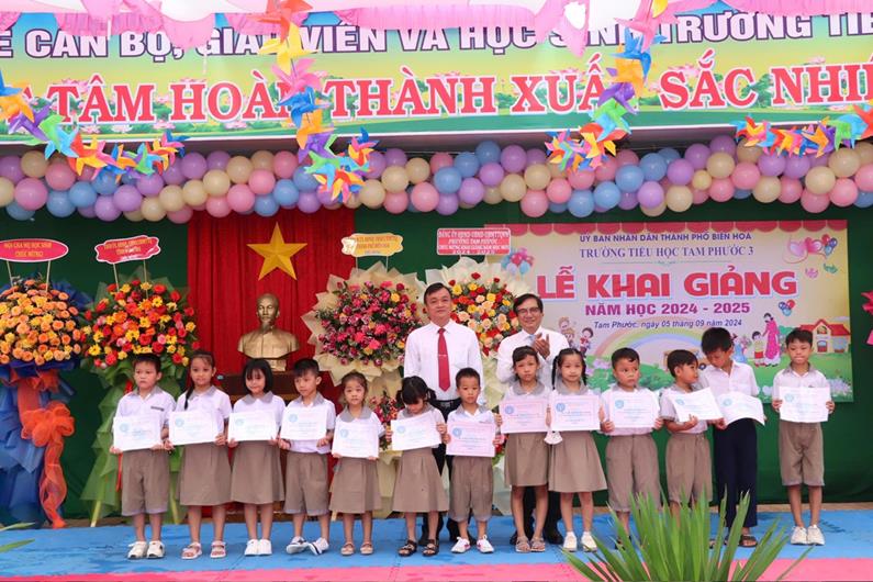 Phó Chủ tịch UBND tỉnh Nguyễn Sơn Hùng đã đến dự, đọc thư của Tổng Bí thư - Chủ tịch nước gửi ngành giáo dục nhân dịp năm học mới; tặng lẵng hoa của Tỉnh ủy -HĐND – UBND - Ủy ban MTTQ Việt Nam tỉnh cho thầy và trò nhà trường. Cùng đi có Phó Bí thư Thường trực Thành ủy Biên Hòa Huỳnh Tấn Đạt và lãnh đạo Phòng Giáo dục và Đào tạo thành phố Biên Hòa, lãnh đạo phường Tam Phước.