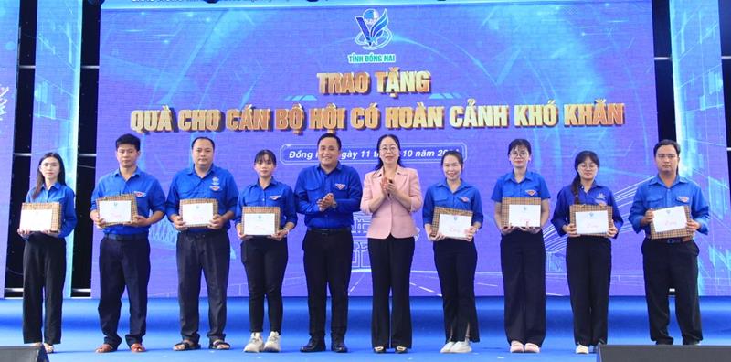 Đại diện Tỉnh đoàn, UBND huyện Định Quán trao quà cho cán bộ Hội có hoàn cảnh khó khăn