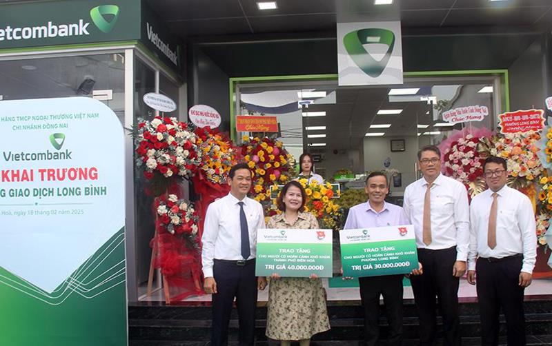 Đại diện Vietcombank chi nhánh Đồng Nai và Phòng giao dịch Long Bình trao bảng hiện kim tổng số tiền 70 triệu đồng dành cho công tác an sinh xã hội cho đại diện Ủy ban MTTQ Việt Nam thành phố Biên Hòa và UBND phường Long Bình nhân dịp khai trương Phòng giao dịch Long Bình.