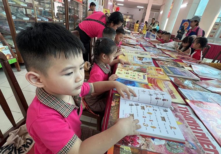 Các em học sinh trường Mầm non tại thành phố Biên Hòa tham quan đọc sách.