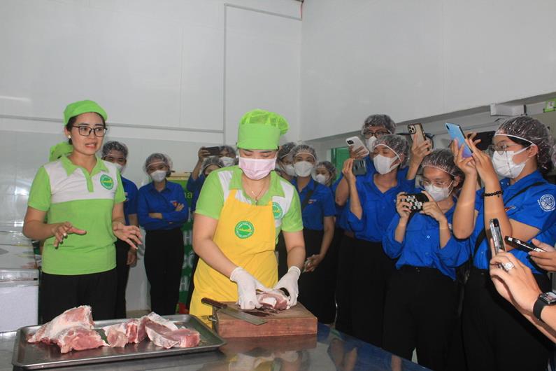 Tại đây, đoàn viên thanh niên đã tham quan trải nghiệm quy trình sản xuất, đóng gói và tiêu thị sản phẩn giò chả đạt chứng nhận OCOP 3 sao; đồng thời tìm hiểu về những thuận lợi, khó khăn của cơ sở trong quá trình hoàn thiện chất lượng sản phẩm, xây dựng thương hiệu, hoàn thiện hồ sơ để sản phẩm được công nhận đạt chuẩn OCOP.