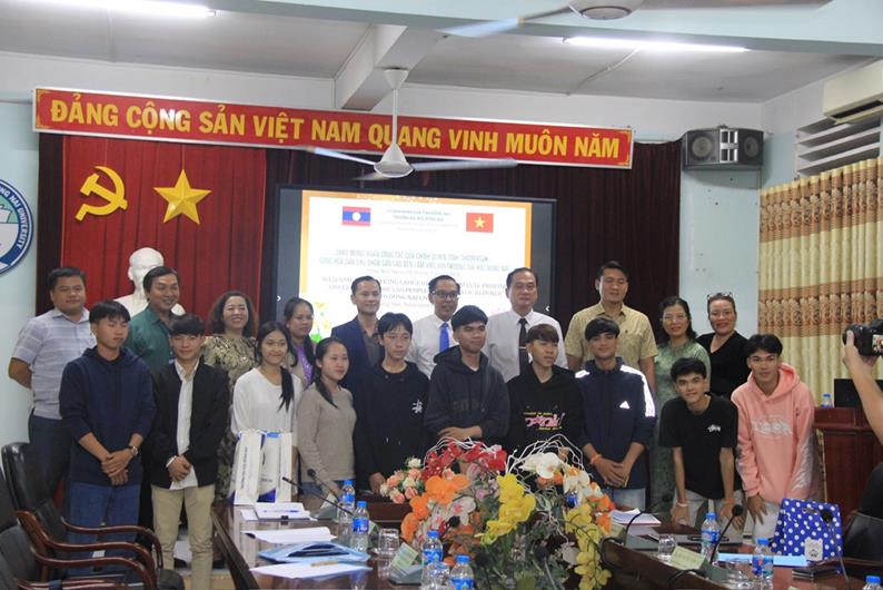 Các đại biểu chụp hình lưu niệm với lưu học sinh tỉnh Champasak