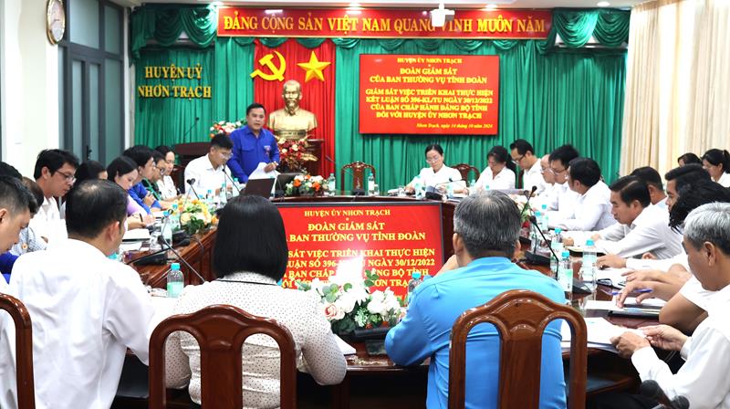 (CTT-Đồng Nai) - Đoàn giám sát của Ban Thường vụ Tỉnh đoàn đã có buổi làm việc với Huyện uỷ Nhơn Trạch về triển khai thực hiện kết luận số 396 của Ban chấp hành (BCH) Đảng bộ tỉnh về việc tiếp tục thực hiện Đề án công tác lãnh đạo và quản lý thanh niên trên địa bàn tỉnh Đồng Nai đến năm 2025.