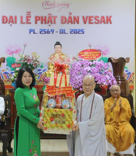 Phó Chủ tịch HĐND tỉnh Hoàng Thị Bích Hằng tặng quà chúc mừng Đại lễ Phật đản Phật lịch 2569 - dương lịch 2025 của Tỉnh ủy - HĐND - UBND - Ủy ban MTTQ Việt Nam tỉnh đến chức sắc Phật giáo tiêu biểu tại Đồng Nai